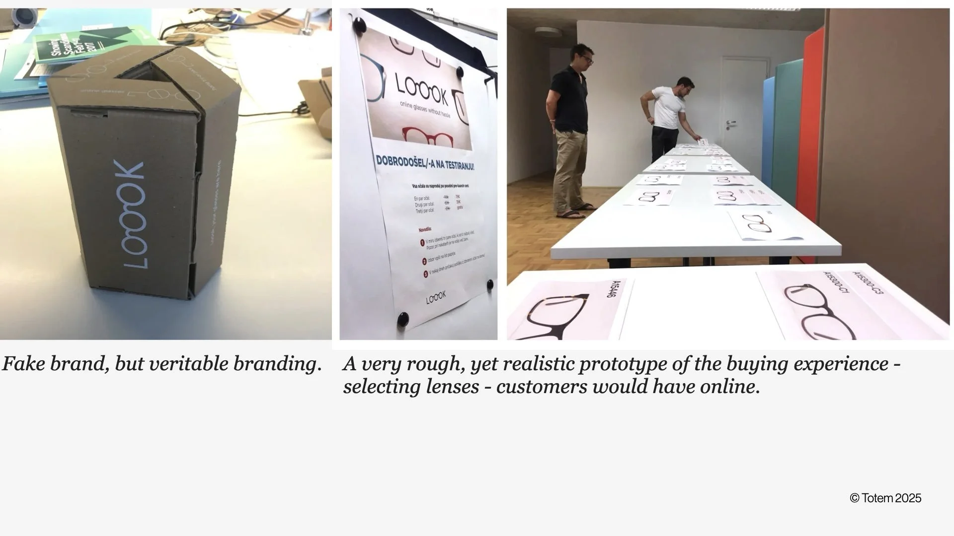 We created a provisional brand called "Loook" complete with thoughtful packaging to establish credibility and perceived value, because users wouldn't take the purchase opportunity seriously without it. We recruited participants who genuinely needed new glasses (had a current prescription, were actively shopping, aged 20-35) through social networks rather than friends or family to maintain objectivity.